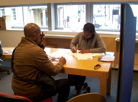 Advice seekers wait to see Senior Solicitor Wendy Pettifer at Dalston CLR James library (May 18 2012)